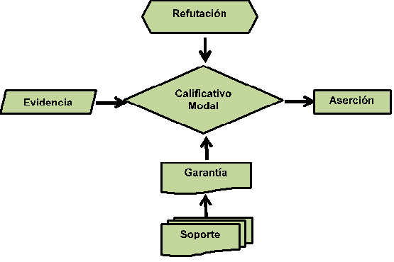 El modelo de Toulmin opera así: a partir de un dato se formula una conclusión (proposición), una garantía conecta los datos con la conclusión y se ofrece un cimiento teórico, práctico o experimental: el respaldo. Los calificadores modales (grado de confianza): probablemente, seguramente, sin duda, tal vez, indican el modo en que se interprete la conclusión como verdadera, contingente o probable. En la refutación se considera sus posibles reservas u objeciones (limitaciones, excepciones, etc.).