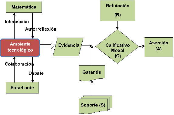 En la Figura 3 se presenta el esquema que describe el modelo en el que se ubica el ambiente tecnológico como mediador en la construcción de argumentos matemáticos, el que se obtiene en esta investigación.